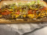 Steak, fried with onions, covered in cheddar cheese, lettuce, tomatoes, mayo, oil & vinegar, banana peppers.